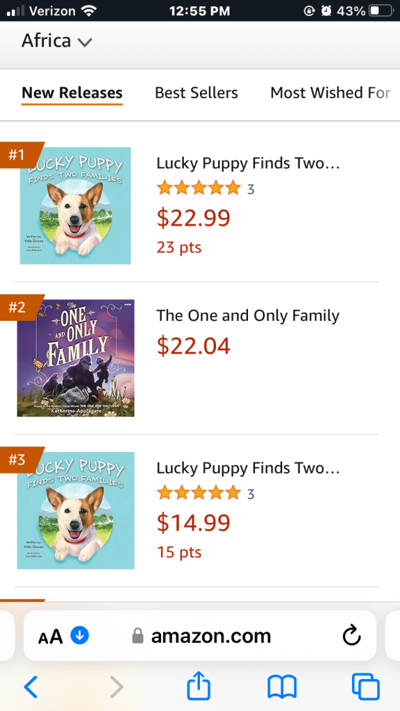 May 1, 2024 Update: Lucky Puppy Finds Two Families is rated #1 on Amazon in Children’s Book – Africa!!